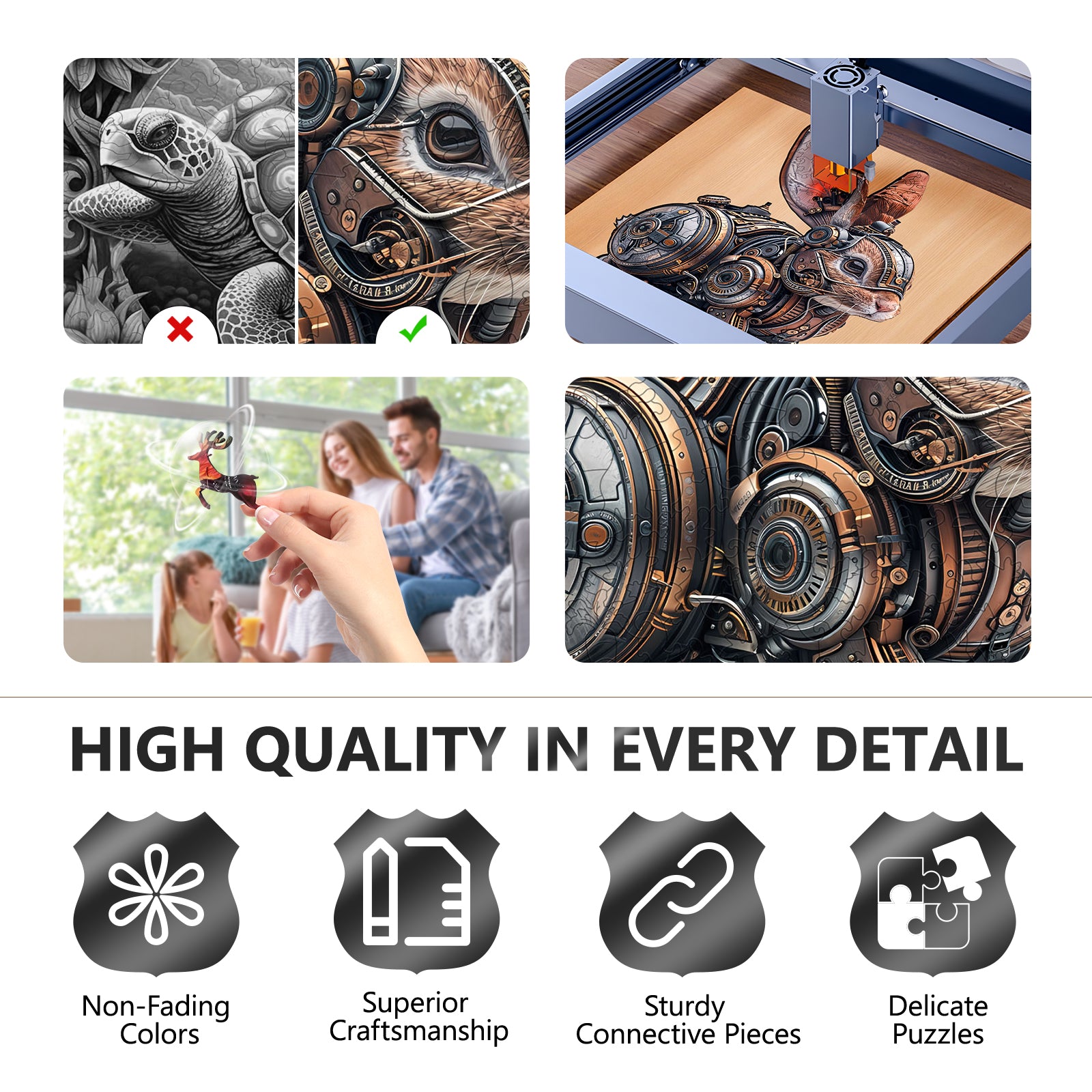 Crafted from eco-friendly, odorless materials, this mechanical rabbit puzzle is both durable and safe for all ages. Each piece is laser-cut with precision, ensuring smooth edges and a perfect fit for easy assembly. The vibrant, UV-printed colors are long-lasting, preserving the beauty of this puzzle for years to come.