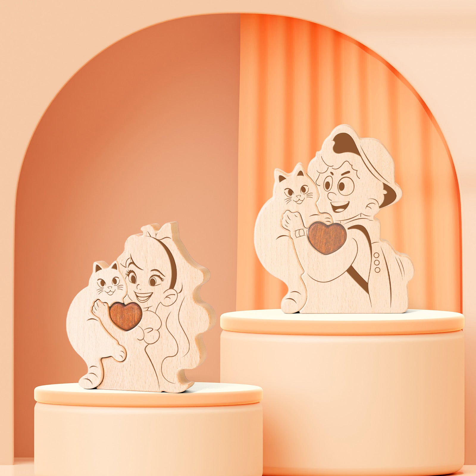 This adorable wooden figure features a girl or boy lovingly hugging a cat, with a heart-shaped cut-out at the center. The design radiates warmth, making it the perfect decor for cat lovers, bringing a smile to anyone’s face.