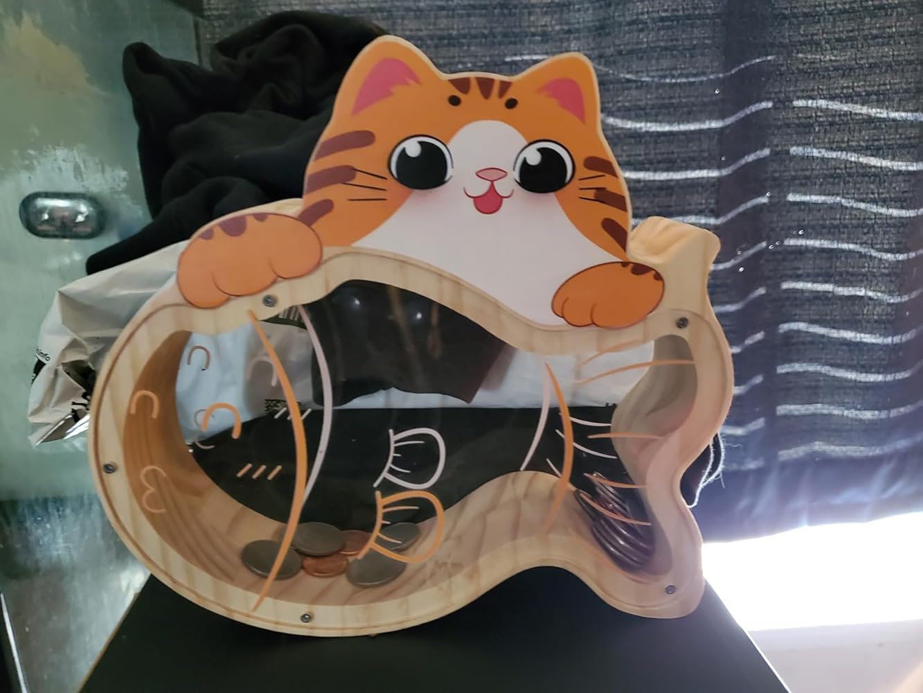 The piggy bank features a cute cat image, is made of natural wood, and has an oversized capacity. The cat is happily catching a fish, as if to show off the progress of the deposit. You can view the storage through the transparent acrylic window to help your child develop the habit of saving money and explore the fun of saving money. The large piggy bank is the perfect gift for children.