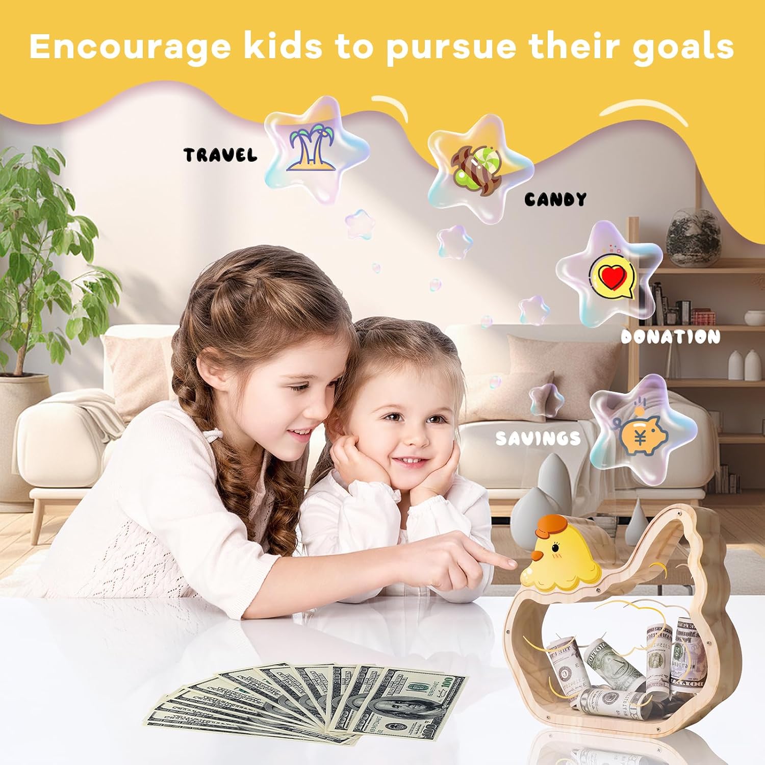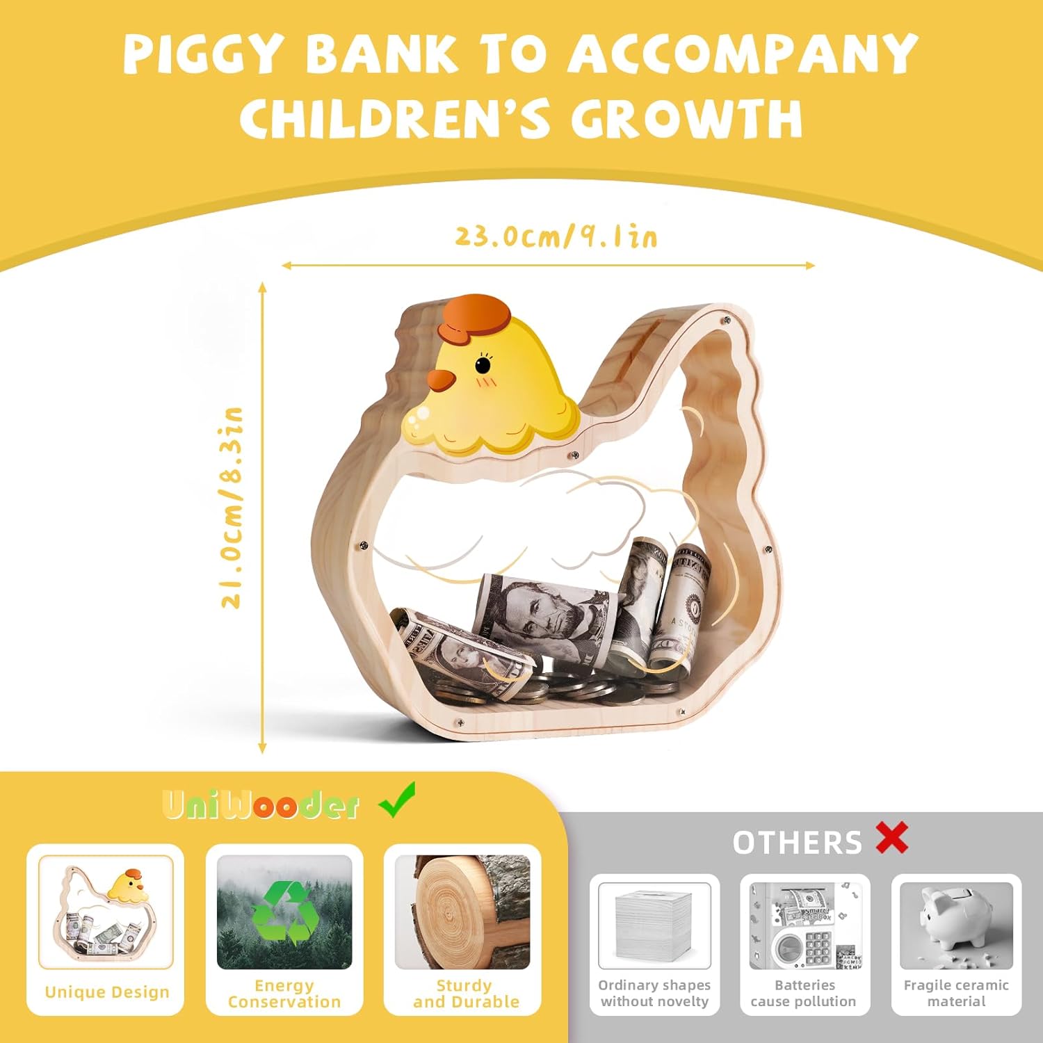 The piggy bank features a cute chicken image, is made of natural wood, and has an oversized capacity. You can view the storage through the transparent acrylic window to help your child develop the habit of saving money and explore the fun of saving money. The large piggy bank is the perfect gift for children.